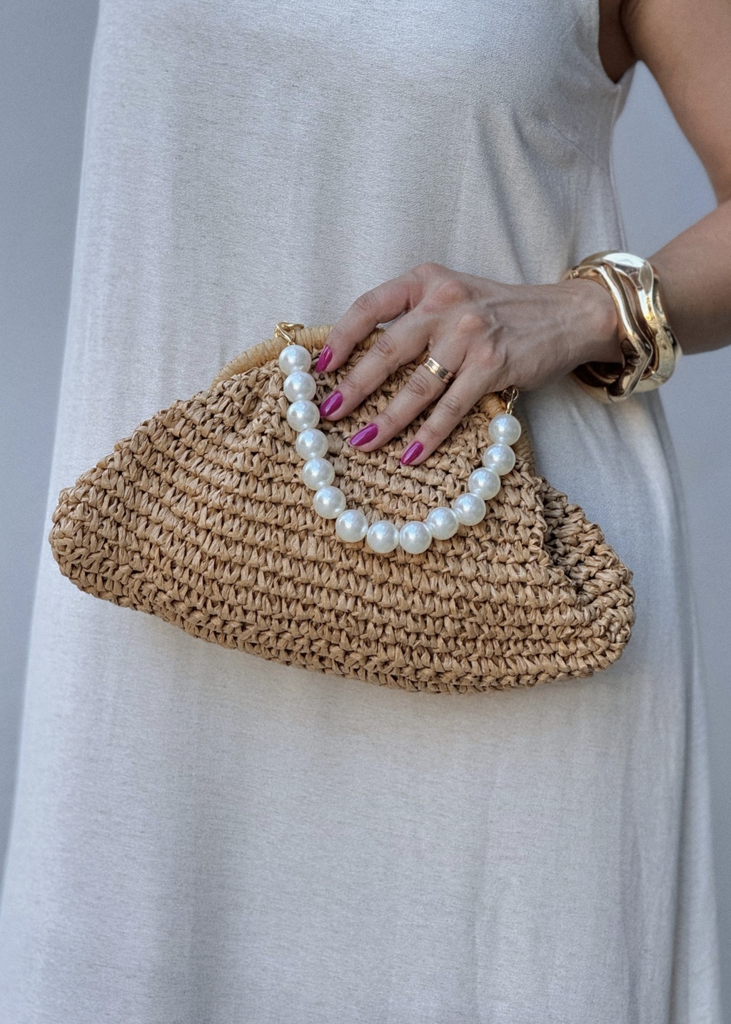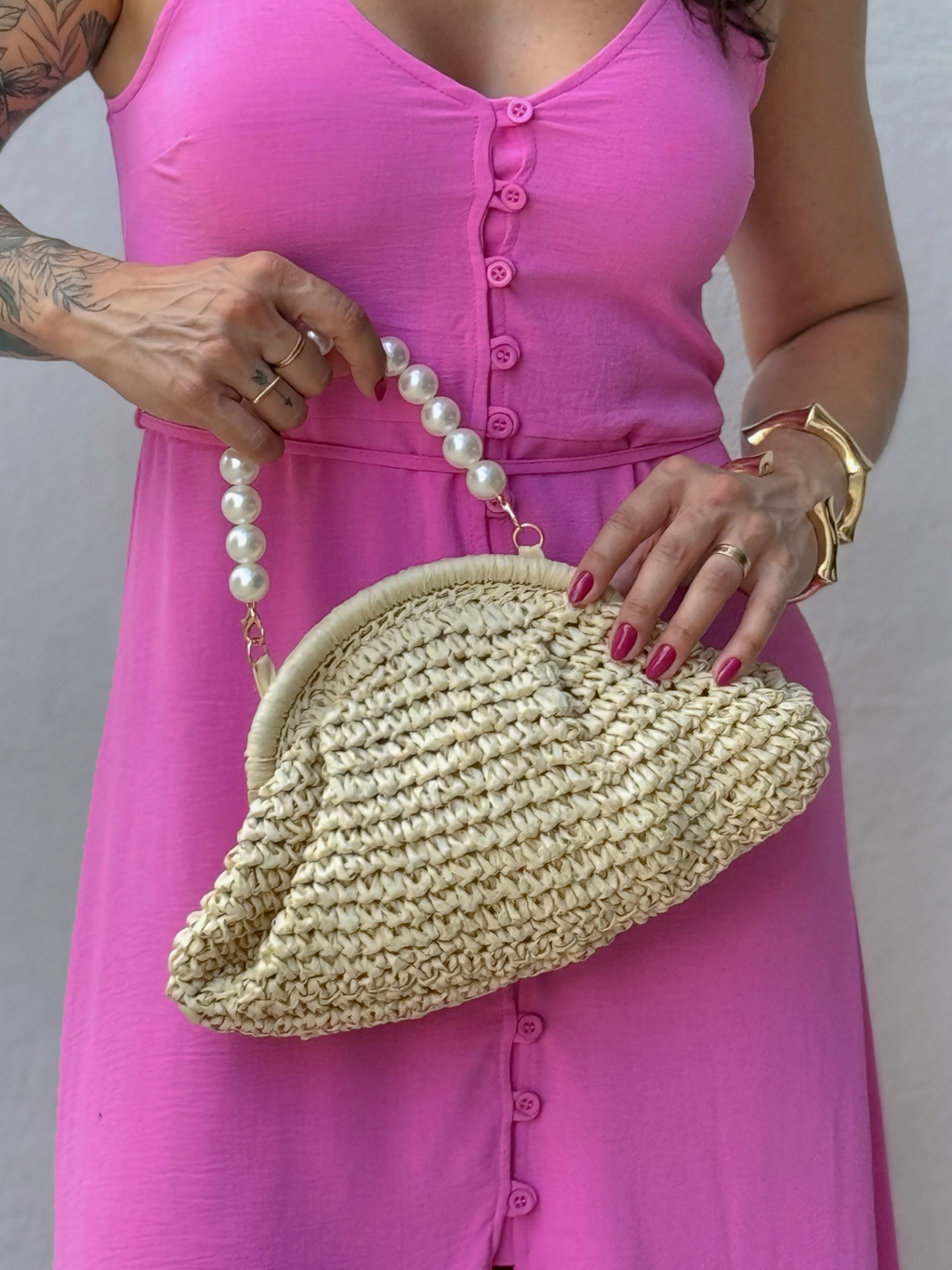 A Bolsa Olga é uma peça única, feita artesanalmente em celulose, que combina estilo e modernidade. Com duas alças em pérolas, sendo uma de pérolas maiores para mão e outra de pérolas menores para ombro, ela se adapta perfeitamente ao seu dia a dia.