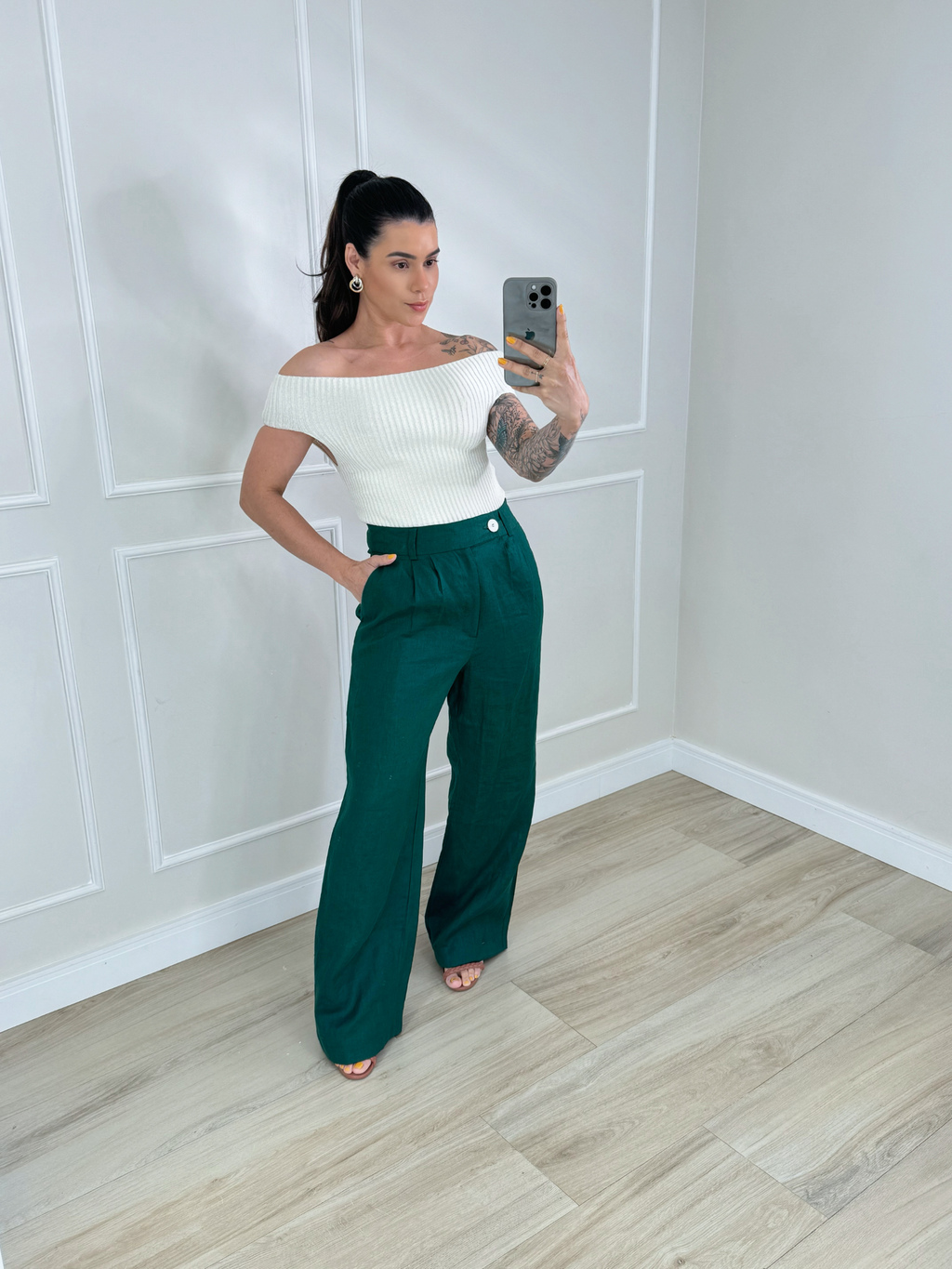 Calça pantalona confeccionada em 100% linho, possui forro, cintura alta, cós com passantes, fechamento por zíper e botão frontal. Possui bolsos frontais e pregas frontais.