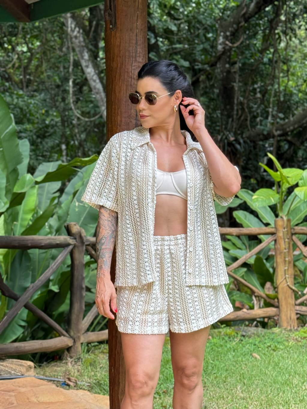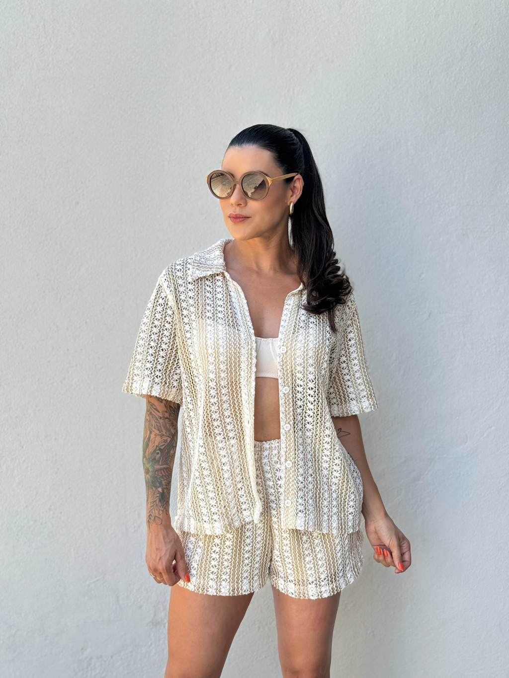 Com um delicado crochê vazado, esta camisa traz um toque moderno e despojado ao seu look.