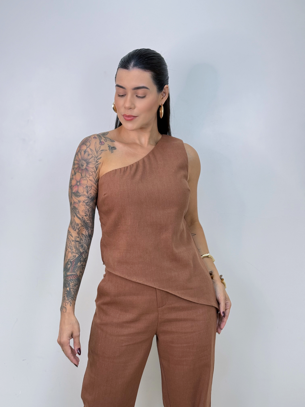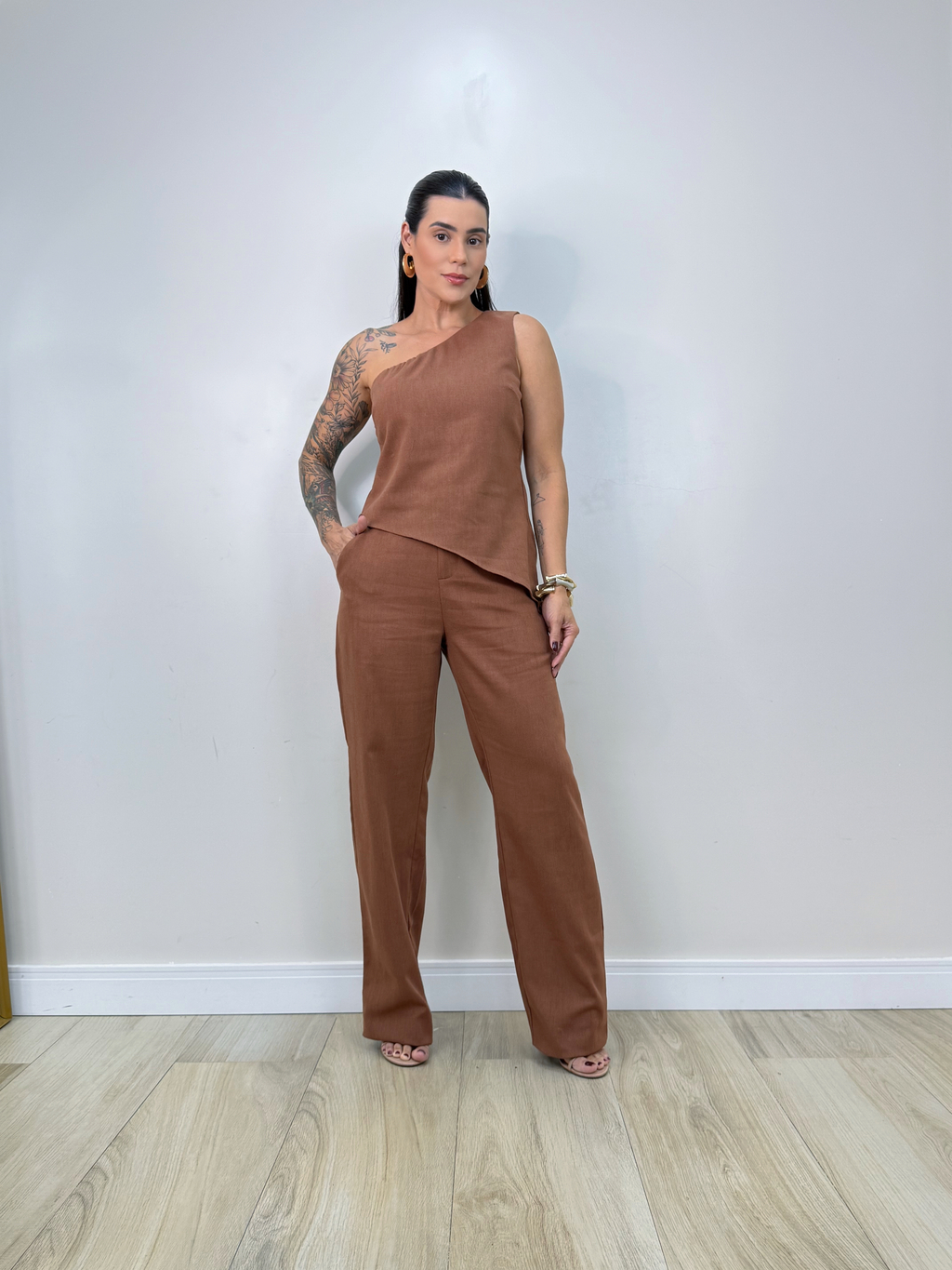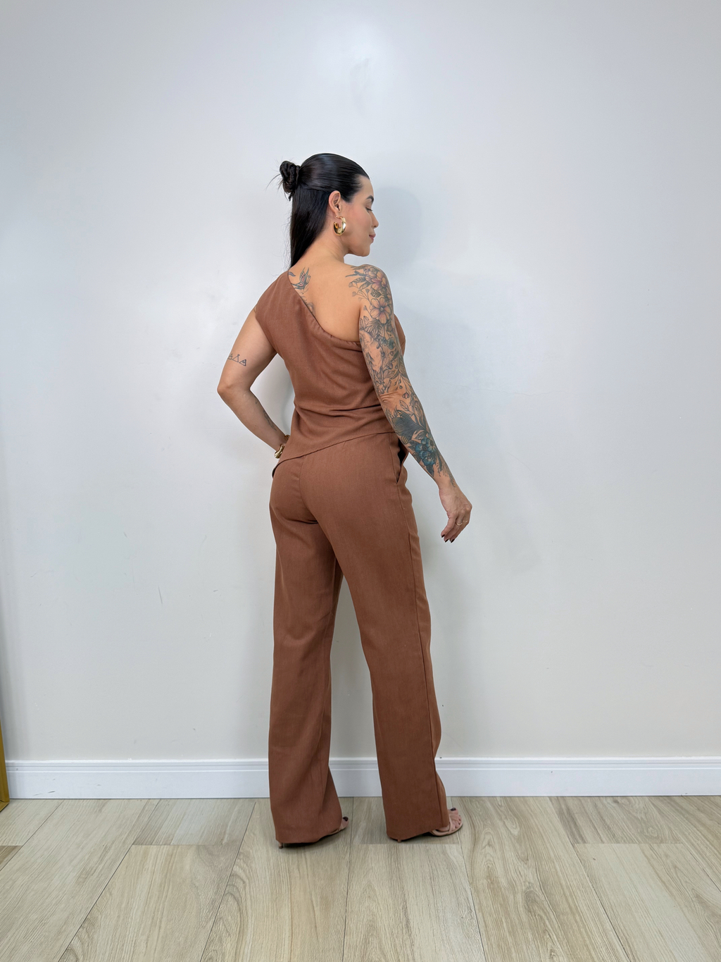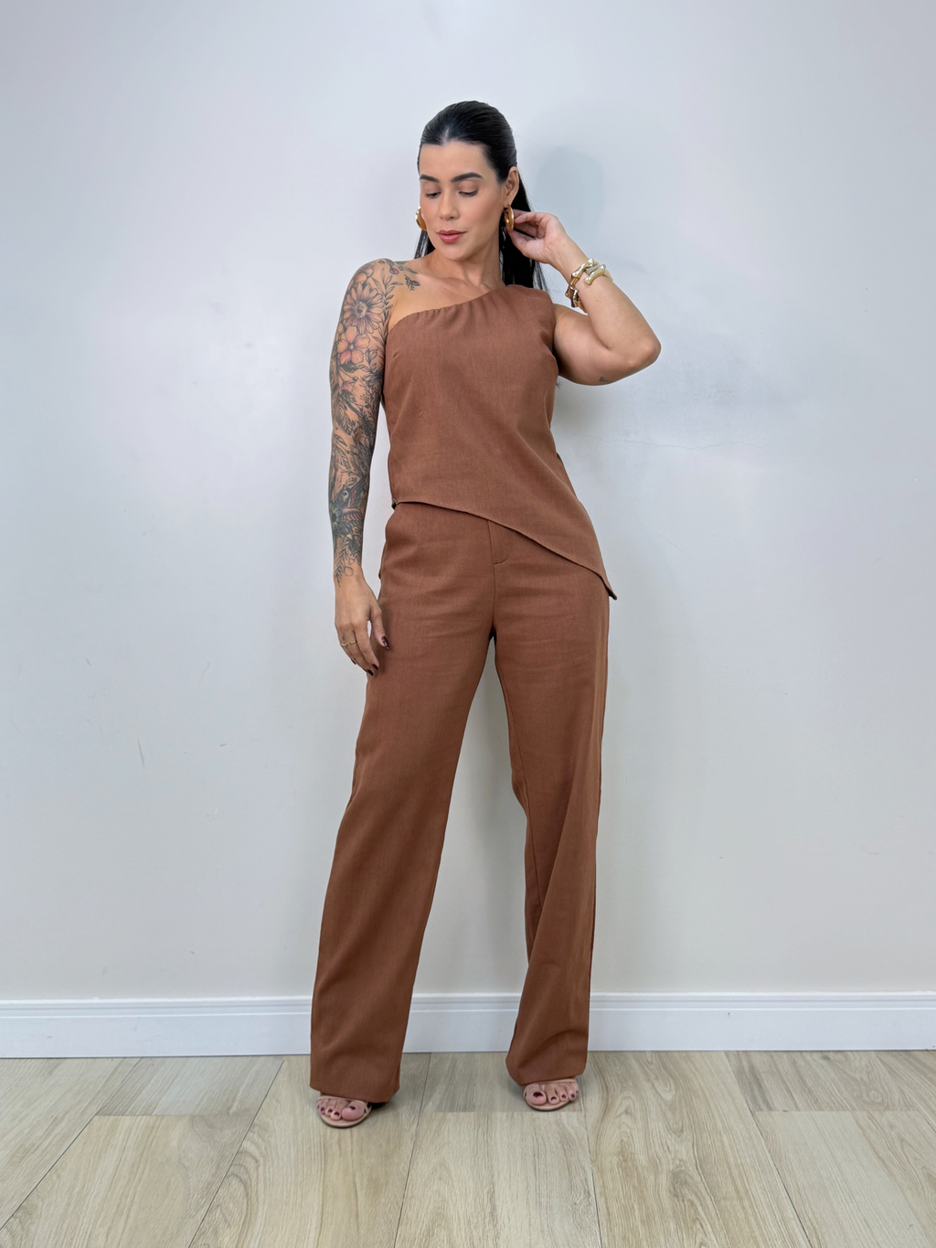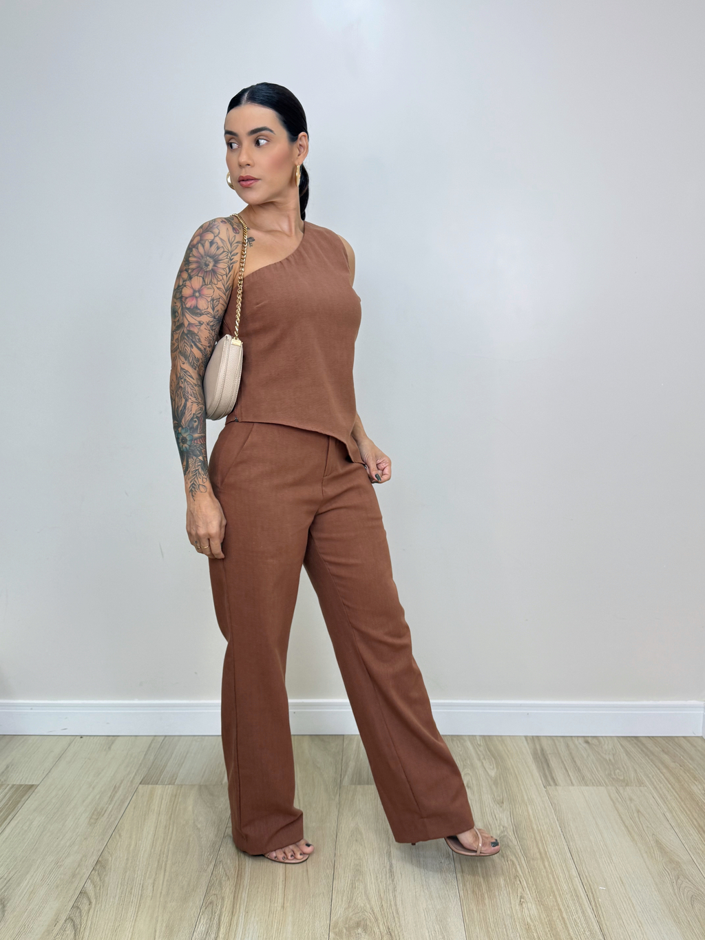 Conjunto composto por calça e blusa, ideal para quem busca um estilo elegante e moderno. A calça com corte alfaiataria possui cintura alta, modelagem reta e bolsos frontais, garantindo um ajuste perfeito e sofisticação ao look. A blusa com design de ombro só adiciona um toque contemporâneo, com fechamento na lateral por zíper e barra assimétrica, perfeita para compor visuais versáteis e cheios de estilo.