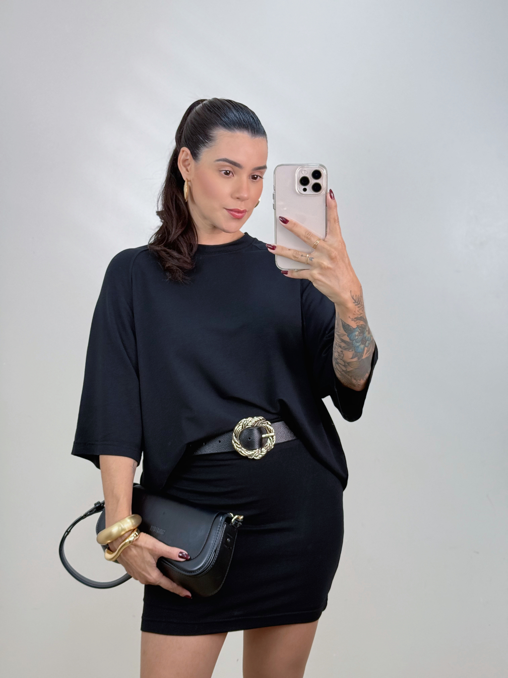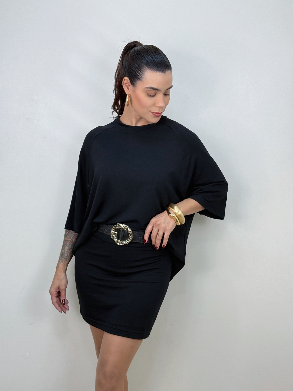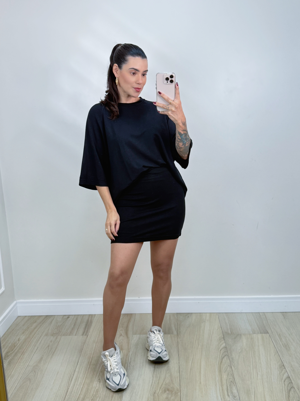 A blusa apresenta modelagem ampla e solta, com gola redonda e mangas 3/4, oferecendo liberdade de movimento. A saia, de comprimento curto e modelagem justa, conta com fechamento por zíper, garantindo um ajuste perfeito ao corpo.