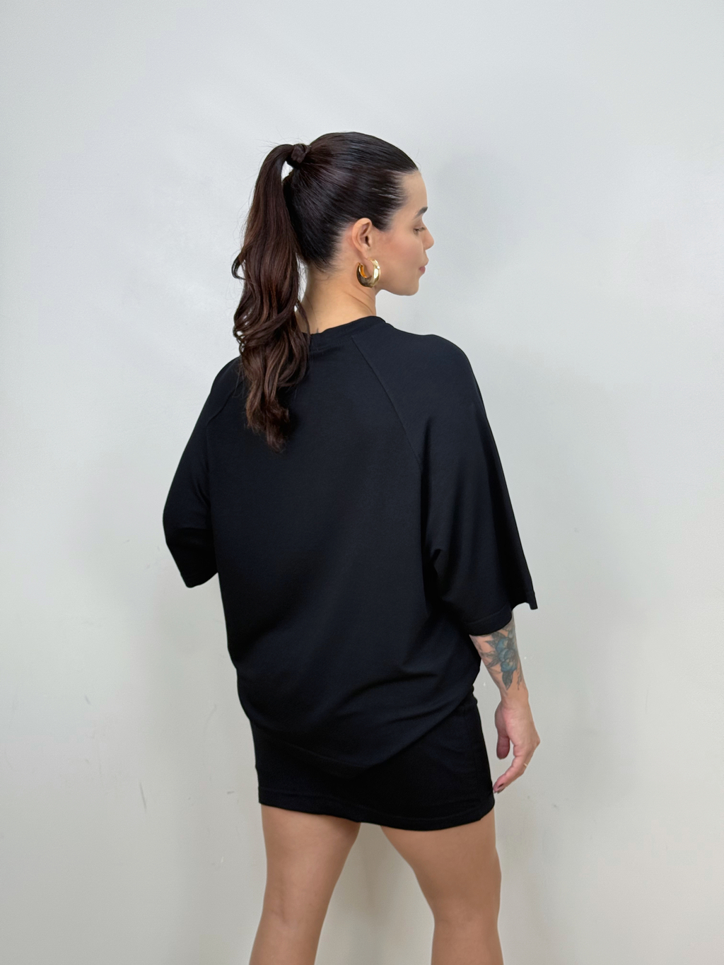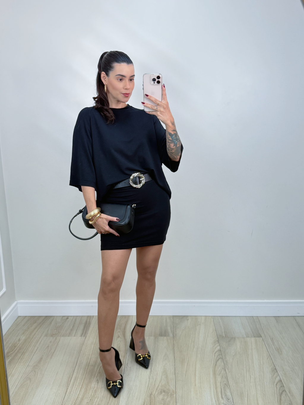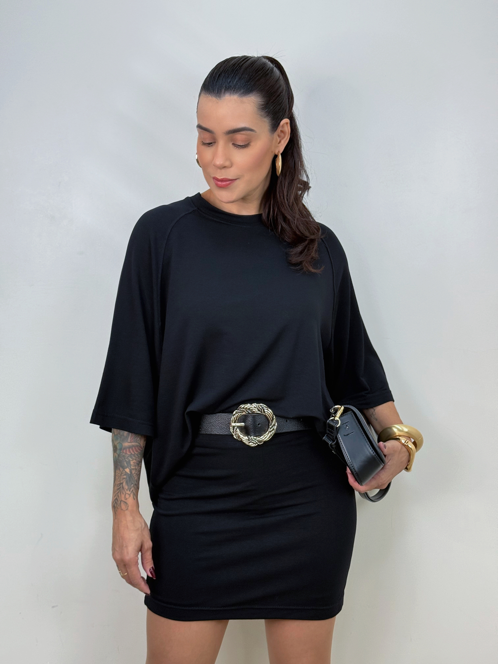 A blusa apresenta modelagem ampla e solta, com gola redonda e mangas 3/4, oferecendo liberdade de movimento. A saia, de comprimento curto e modelagem justa, conta com fechamento por zíper, garantindo um ajuste perfeito ao corpo.