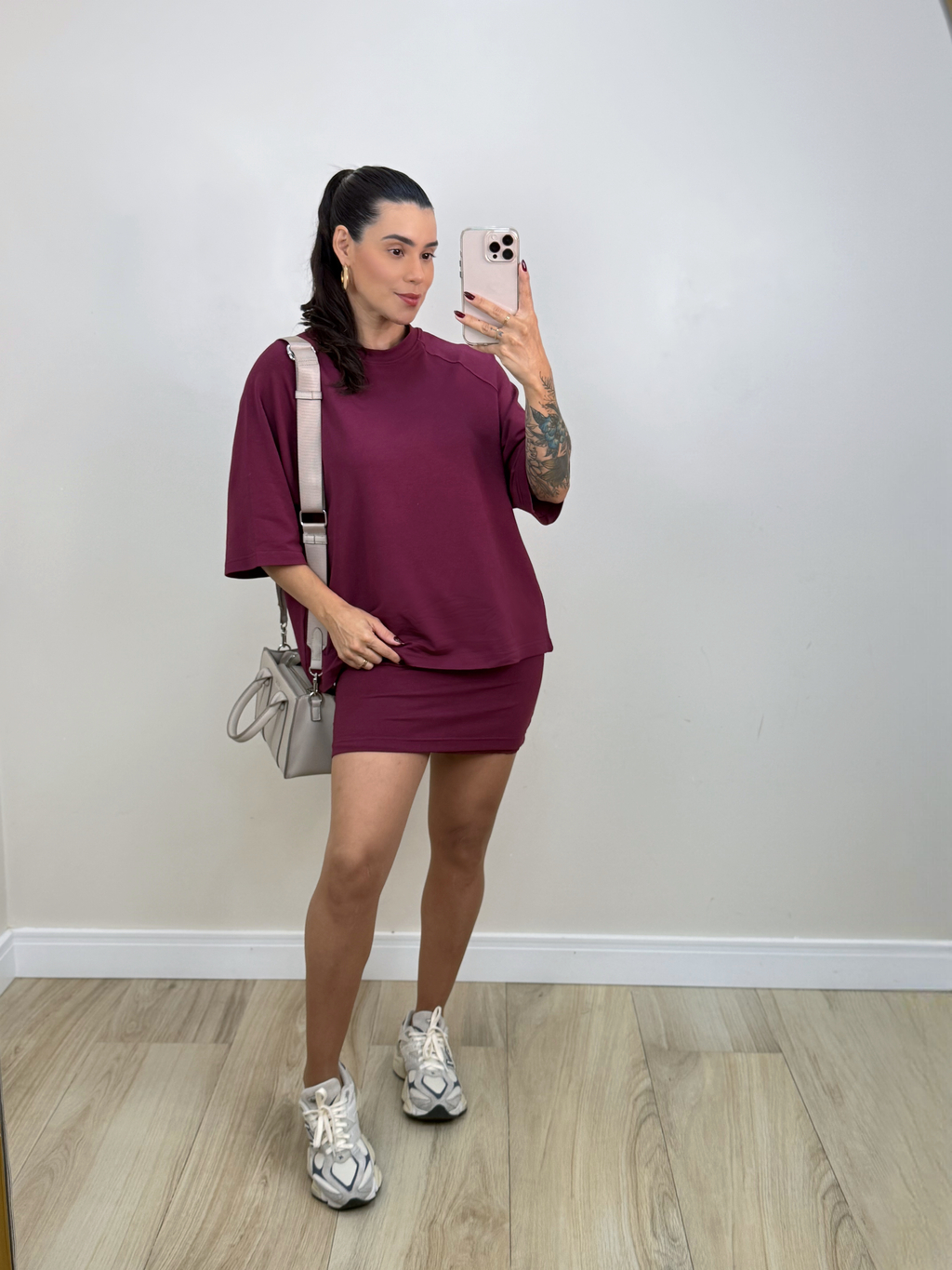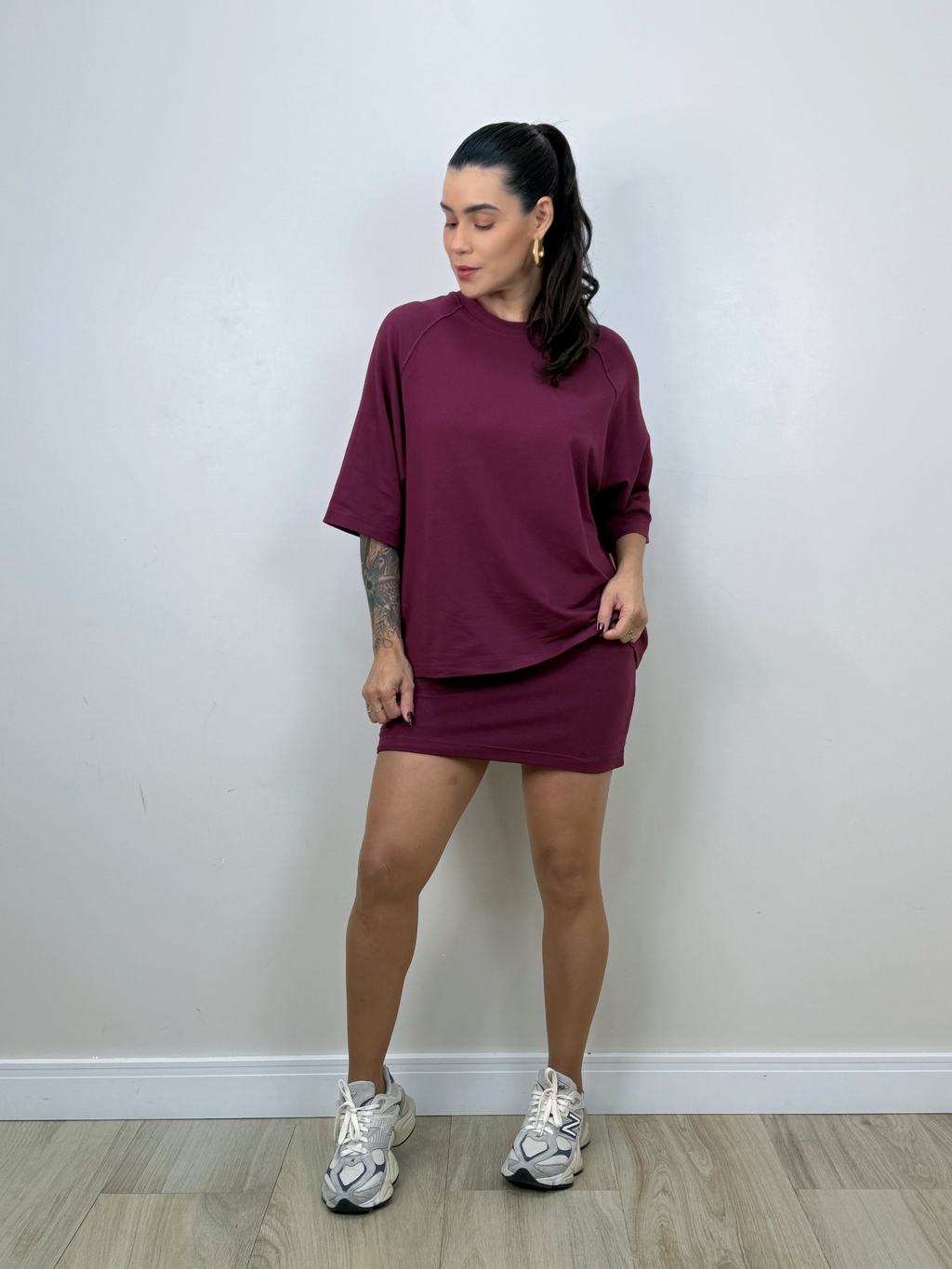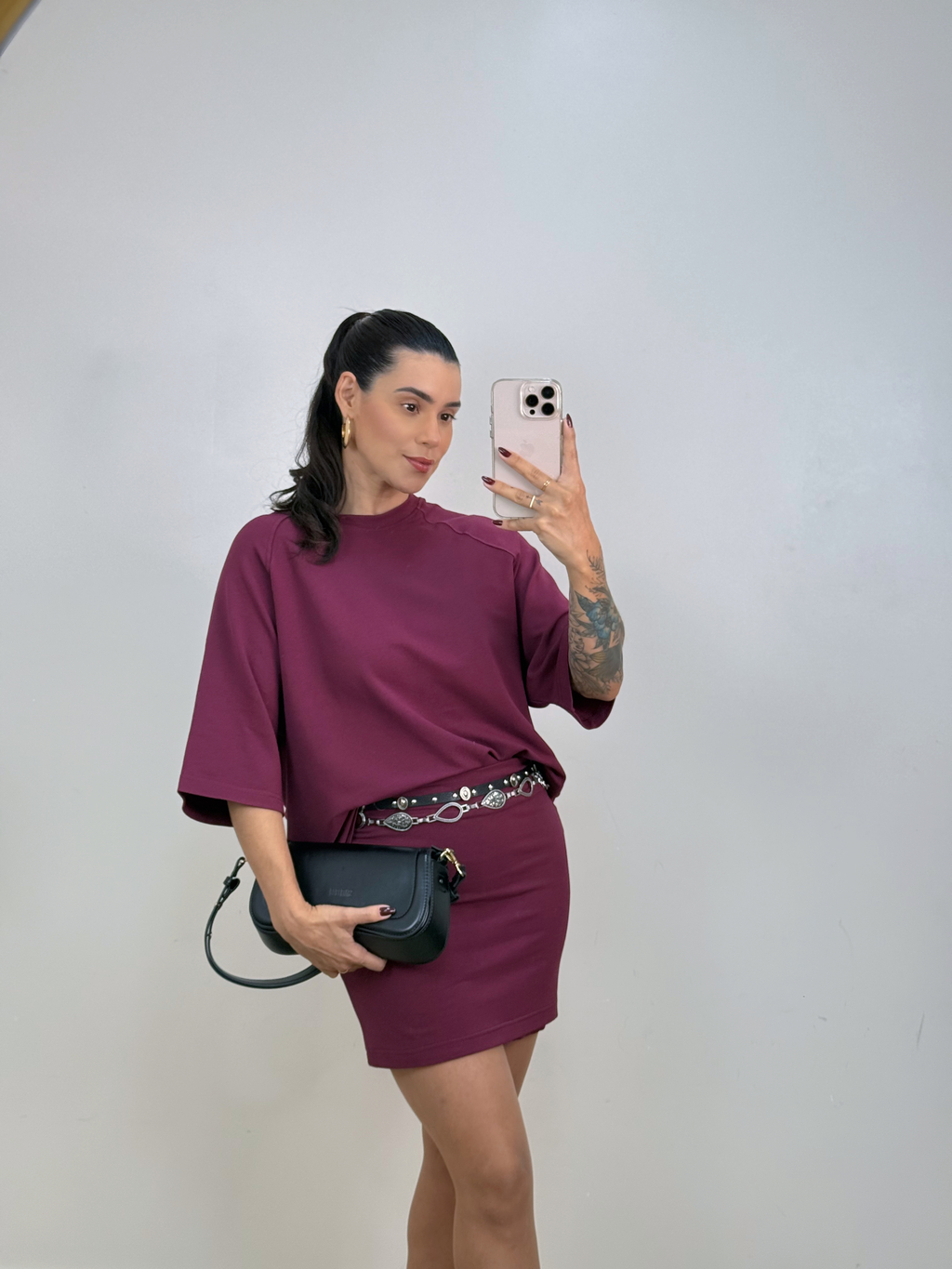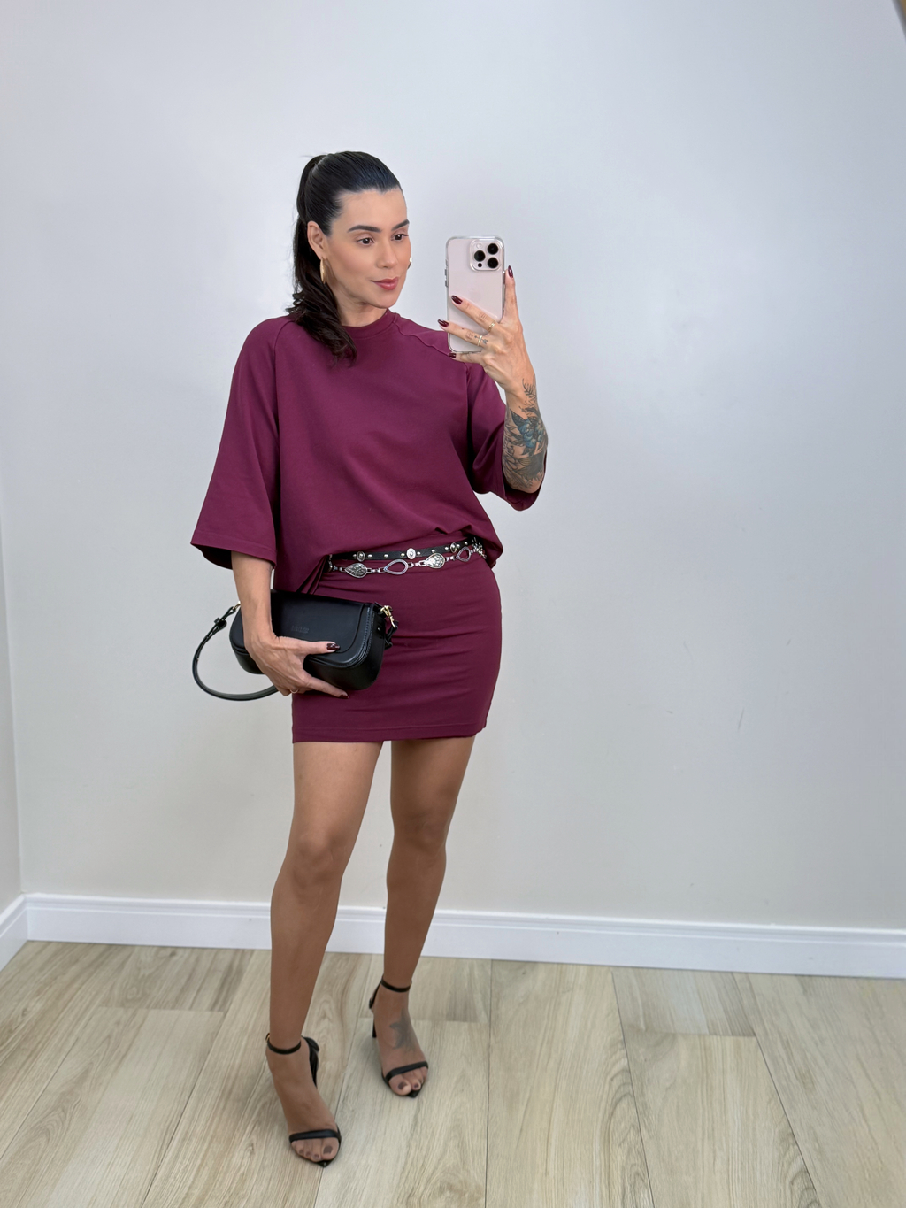 A blusa apresenta modelagem ampla e solta, com gola redonda e mangas 3/4, oferecendo liberdade de movimento. A saia, de comprimento curto e modelagem justa, conta com fechamento por zíper, garantindo um ajuste perfeito ao corpo.
