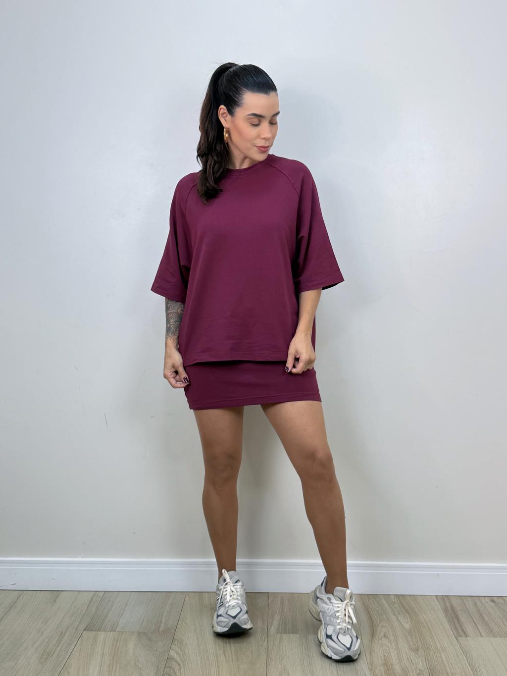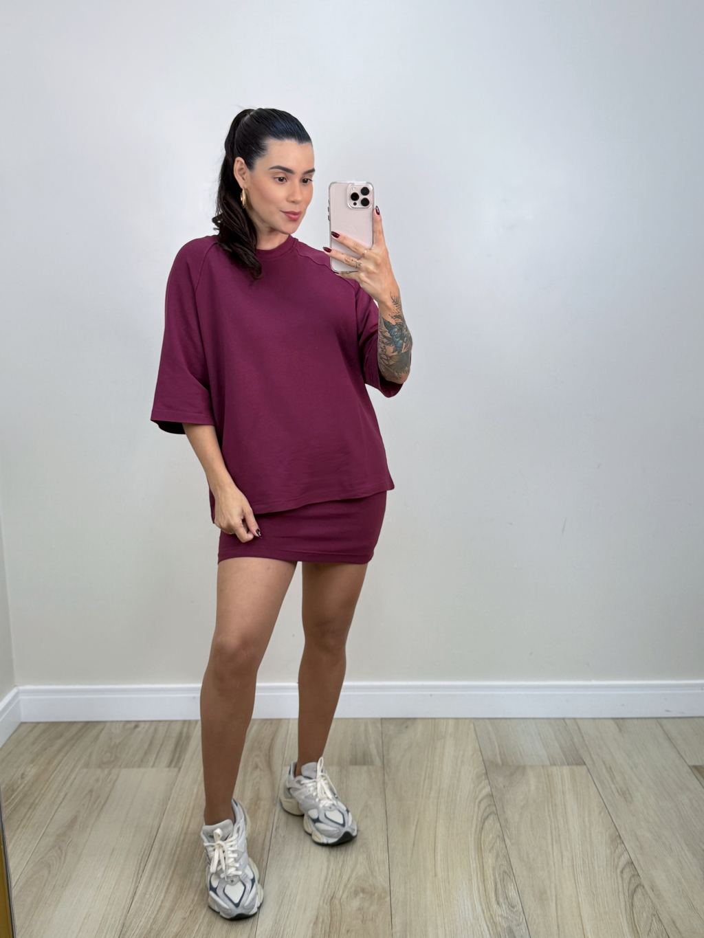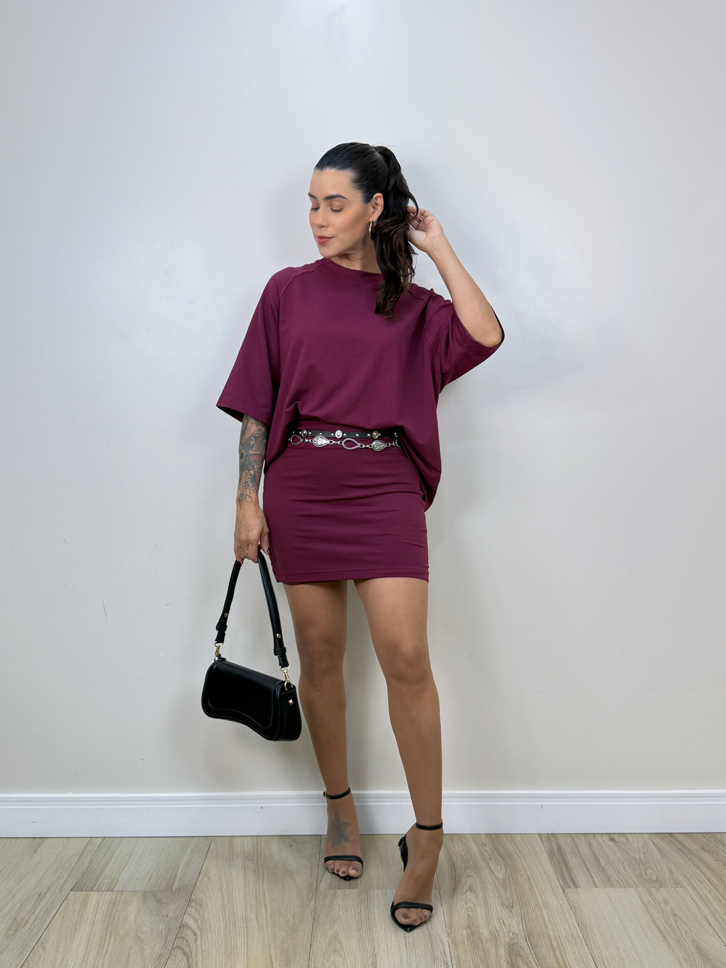 A blusa apresenta modelagem ampla e solta, com gola redonda e mangas 3/4, oferecendo liberdade de movimento. A saia, de comprimento curto e modelagem justa, conta com fechamento por zíper, garantindo um ajuste perfeito ao corpo.