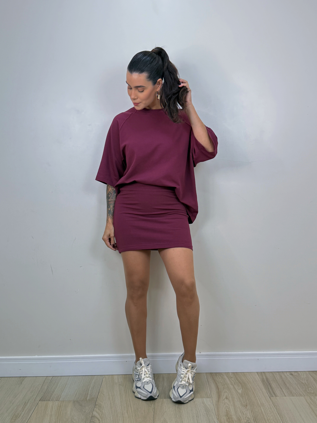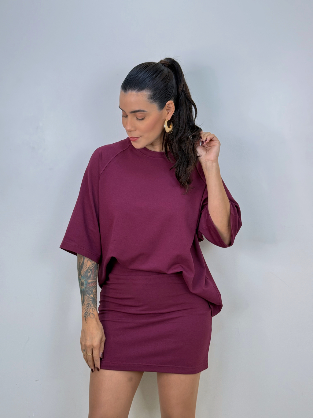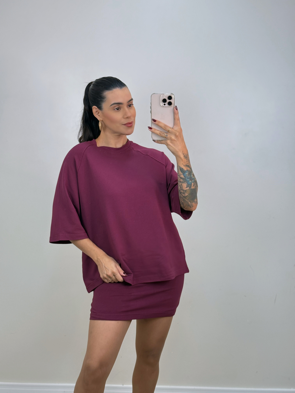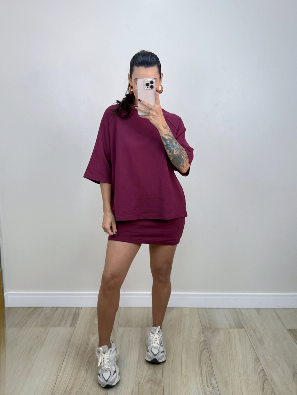 A blusa apresenta modelagem ampla e solta, com gola redonda e mangas 3/4, oferecendo liberdade de movimento. A saia, de comprimento curto e modelagem justa, conta com fechamento por zíper, garantindo um ajuste perfeito ao corpo.