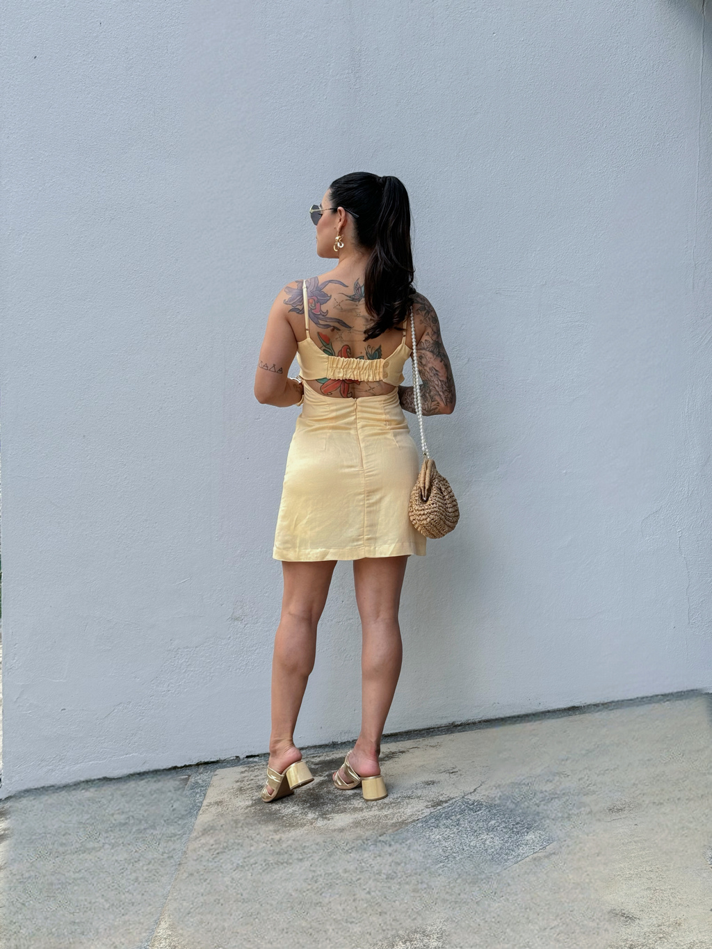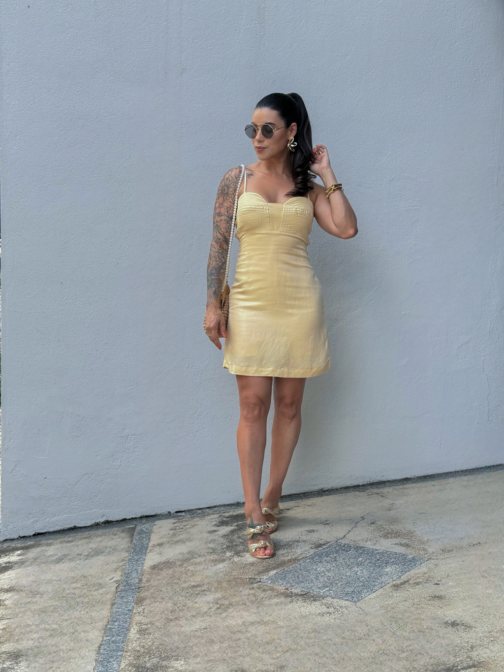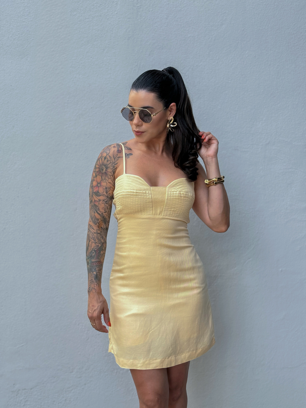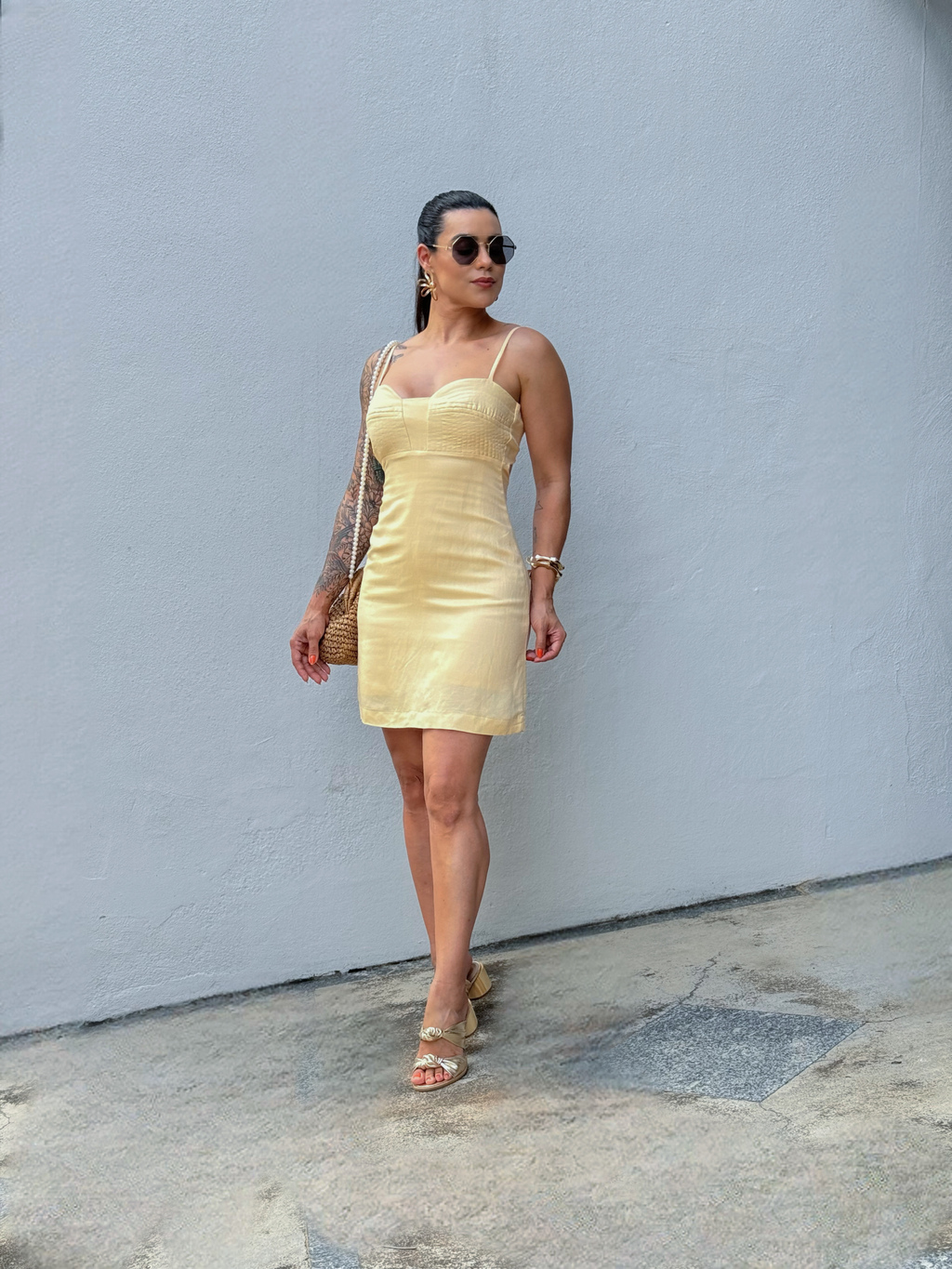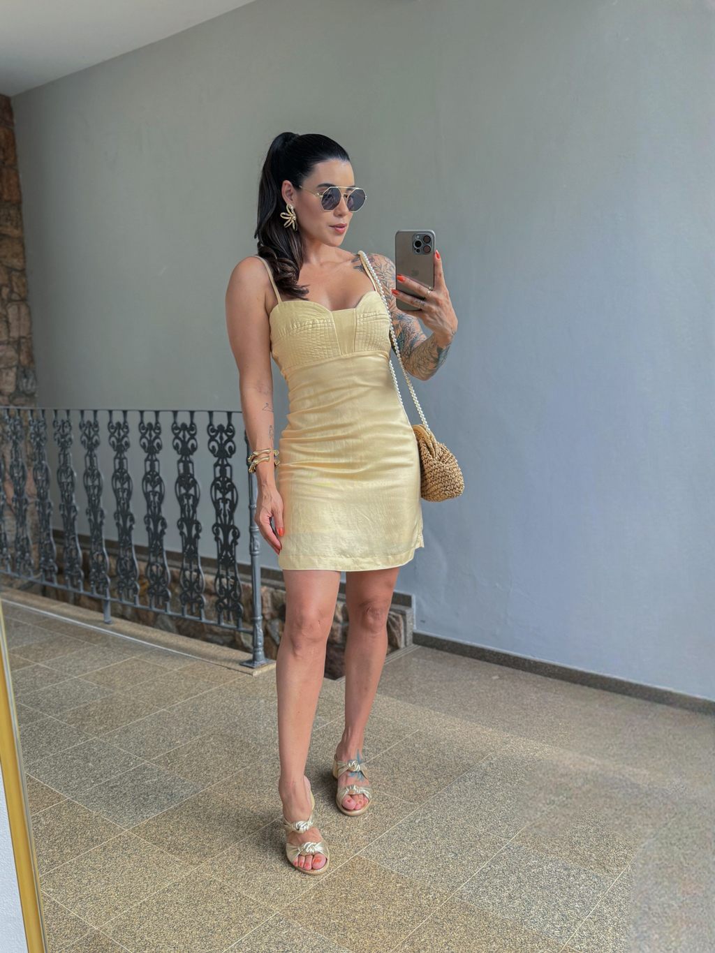 Com alças finas reguláveis e um busto estruturado com detalhes, ele se destaca por sua modelagem que parece um vestido, mas possui um shortinho por baixo para maior praticidade. Confeccionado em uma mistura suave de viscose com linho, é ideal para dias quentes. Possui alças finas com regulagem, fechamento por botão e elástico nas costas, pequena abertura nas parte de trás da cintura e zíper invisel para fechamento.
