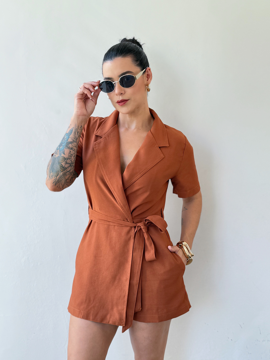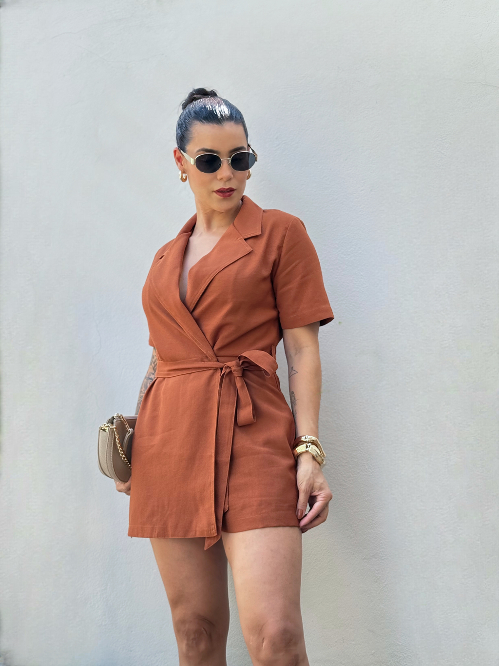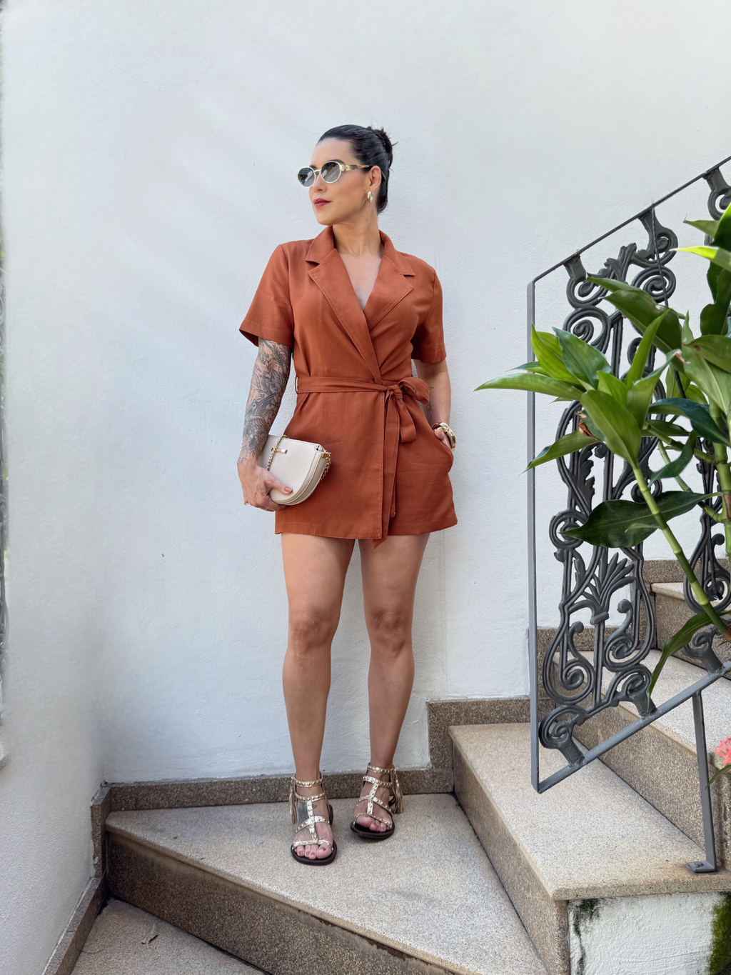 Macaquinho Micaela foi confeccionado com corte de alfaiataria, possui mangas curtas e gola estilo blazer que trazem um toque sofisticado e elegante. Sua modelagem transpassada com amarração lateral por faixa no mesmo tecido se ajusta ao corpo, enquanto o fechamento interno por zíper e botão garante o ajuste perfeito.