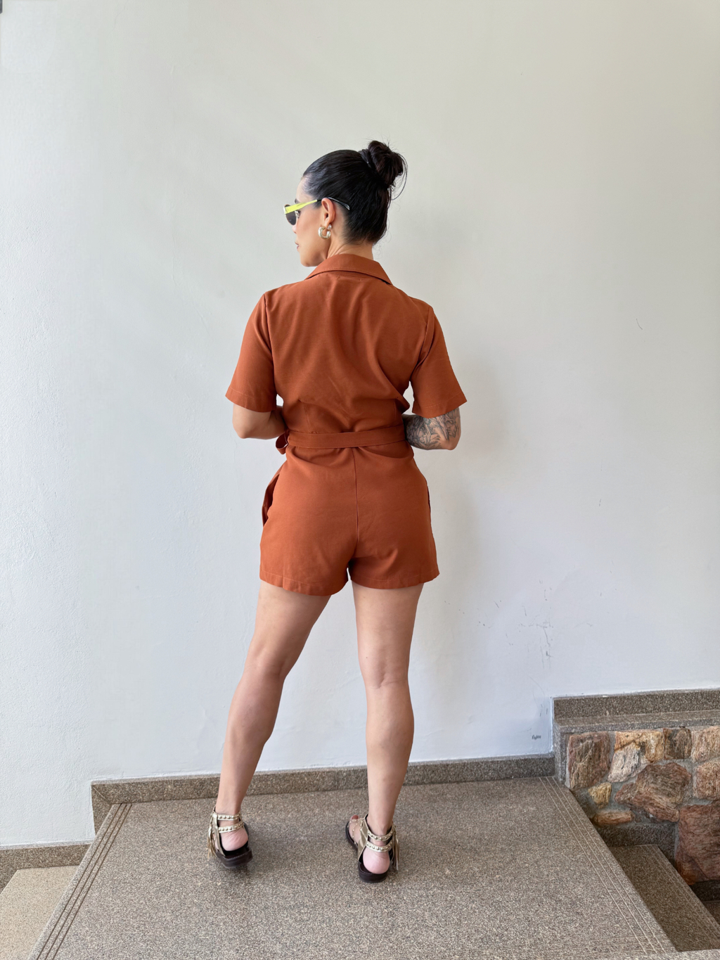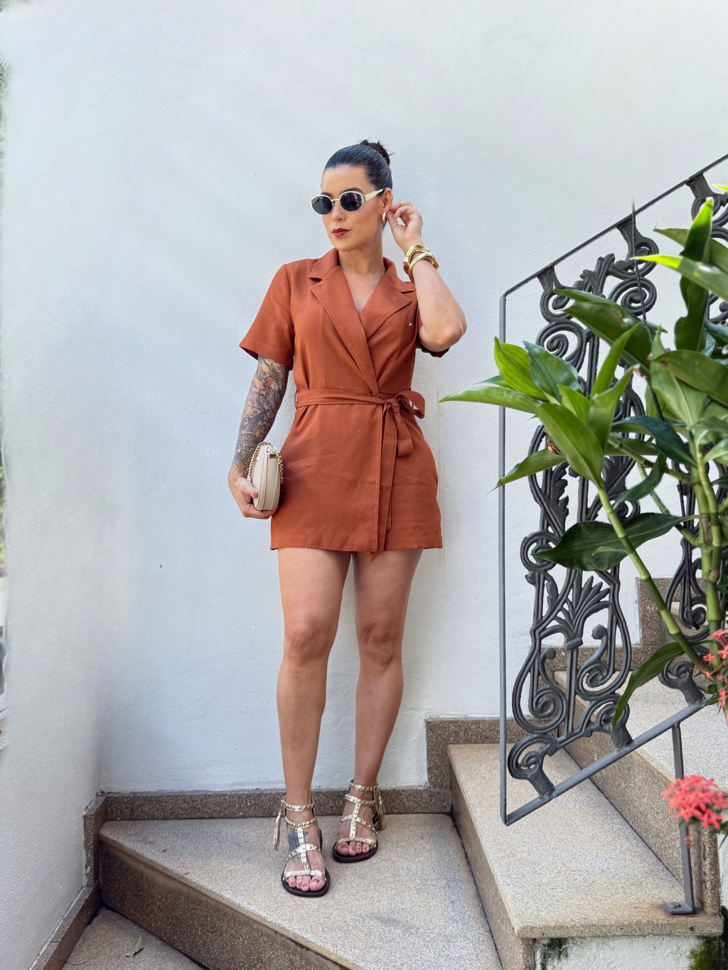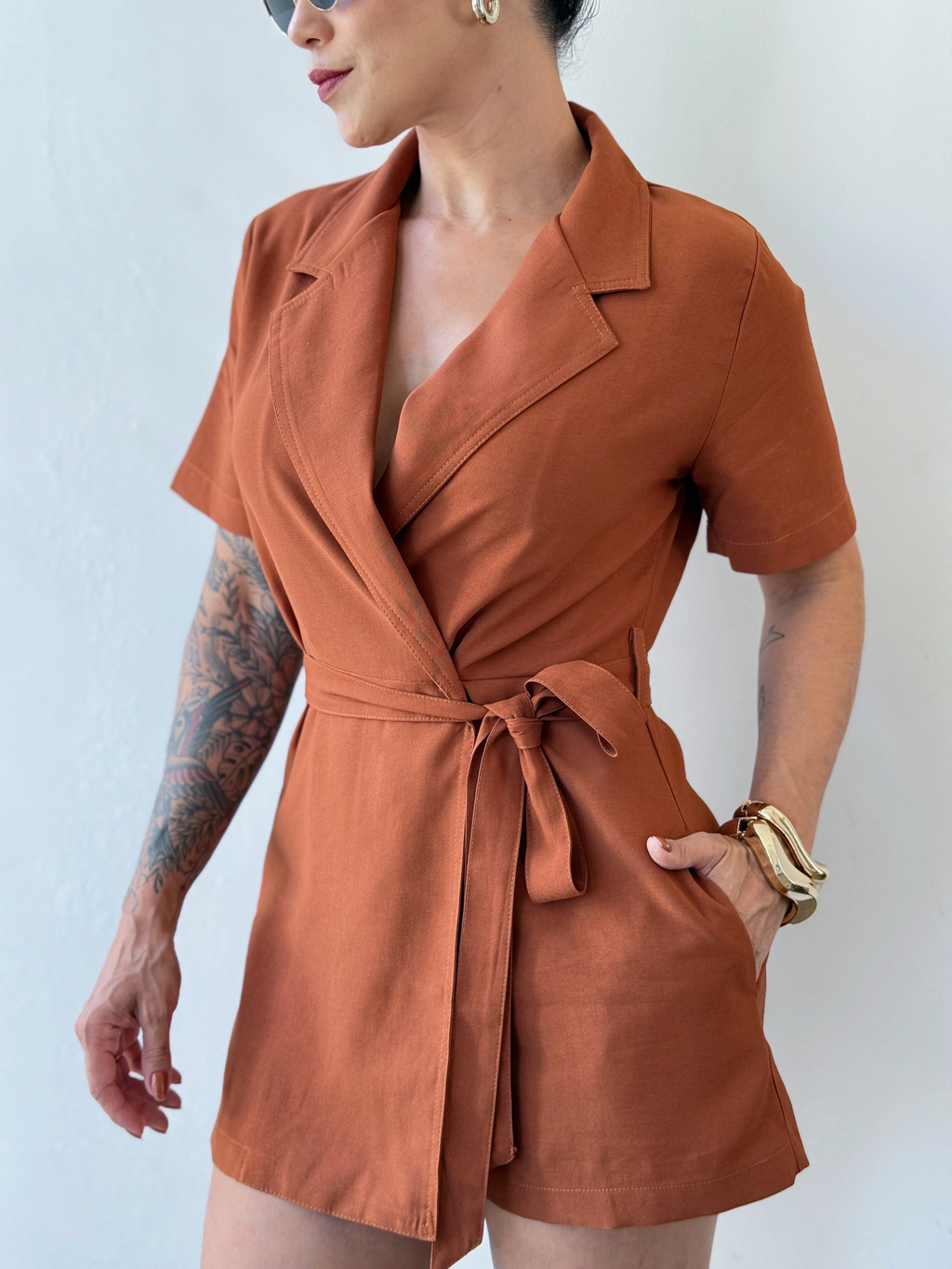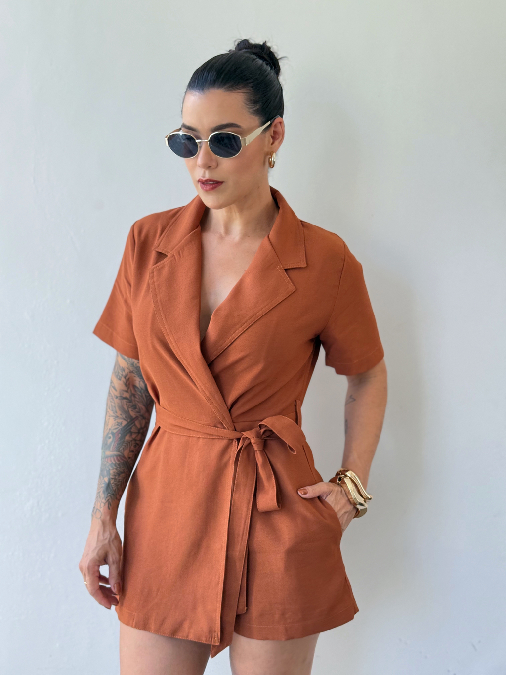Macaquinho Micaela foi confeccionado com corte de alfaiataria, possui mangas curtas e gola estilo blazer que trazem um toque sofisticado e elegante. Sua modelagem transpassada com amarração lateral por faixa no mesmo tecido se ajusta ao corpo, enquanto o fechamento interno por zíper e botão garante o ajuste perfeito.