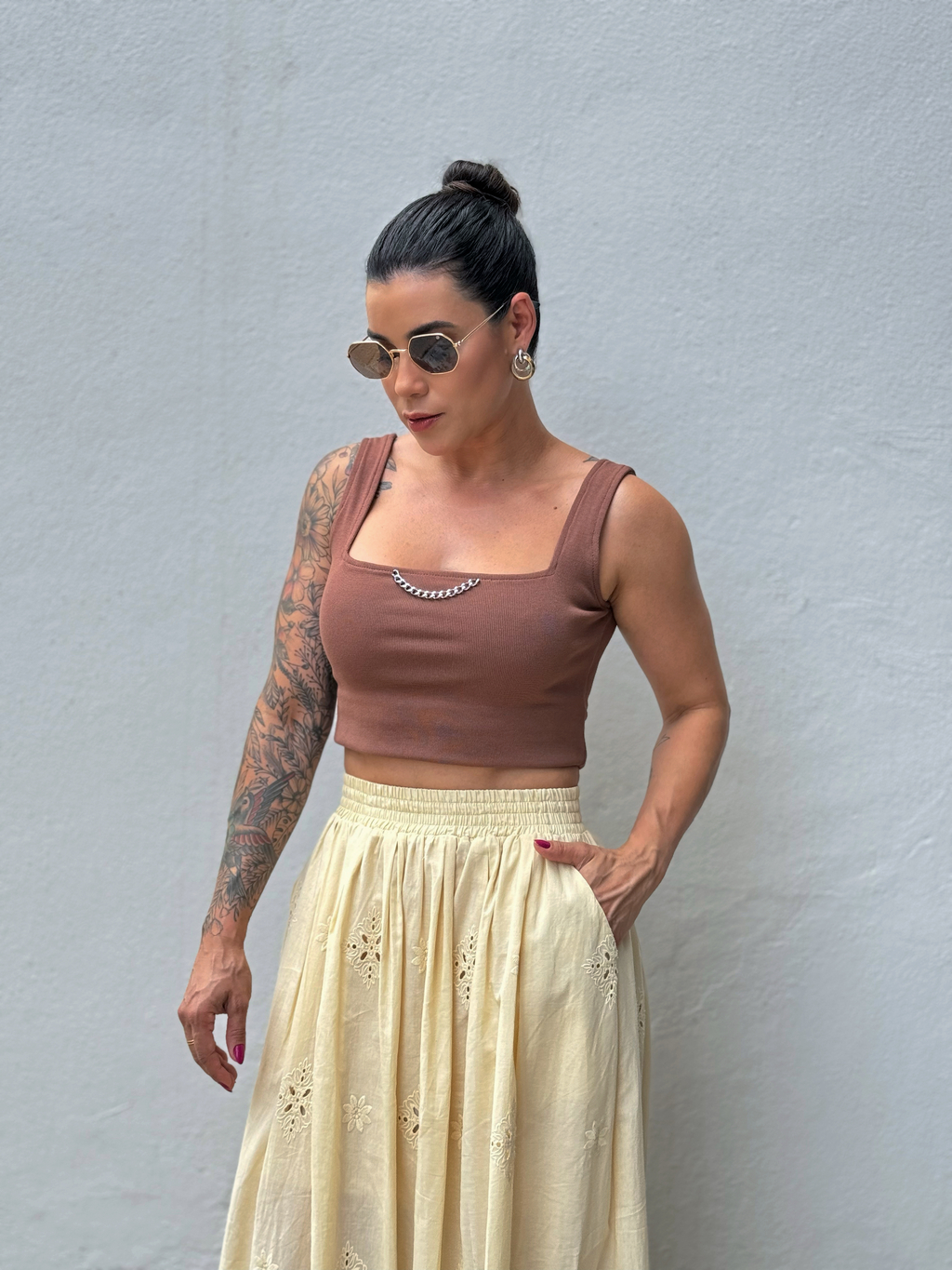 Com um cos elástico que proporciona um ajuste perfeito, esta saia é ideal para diversas ocasiões.