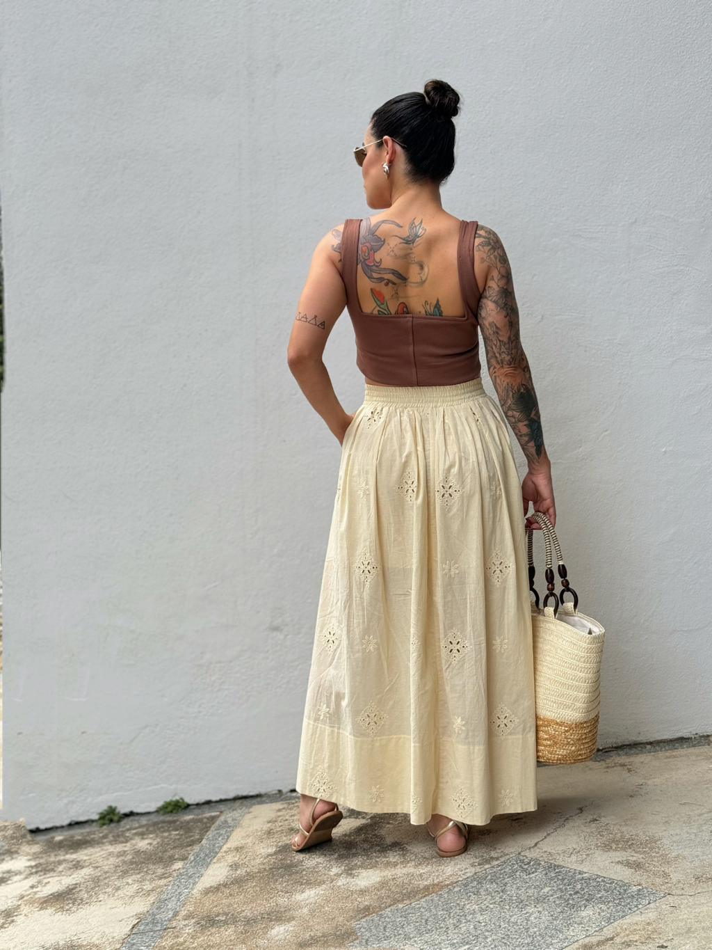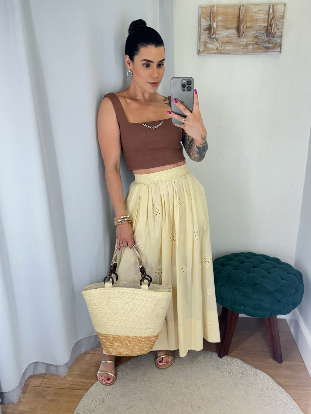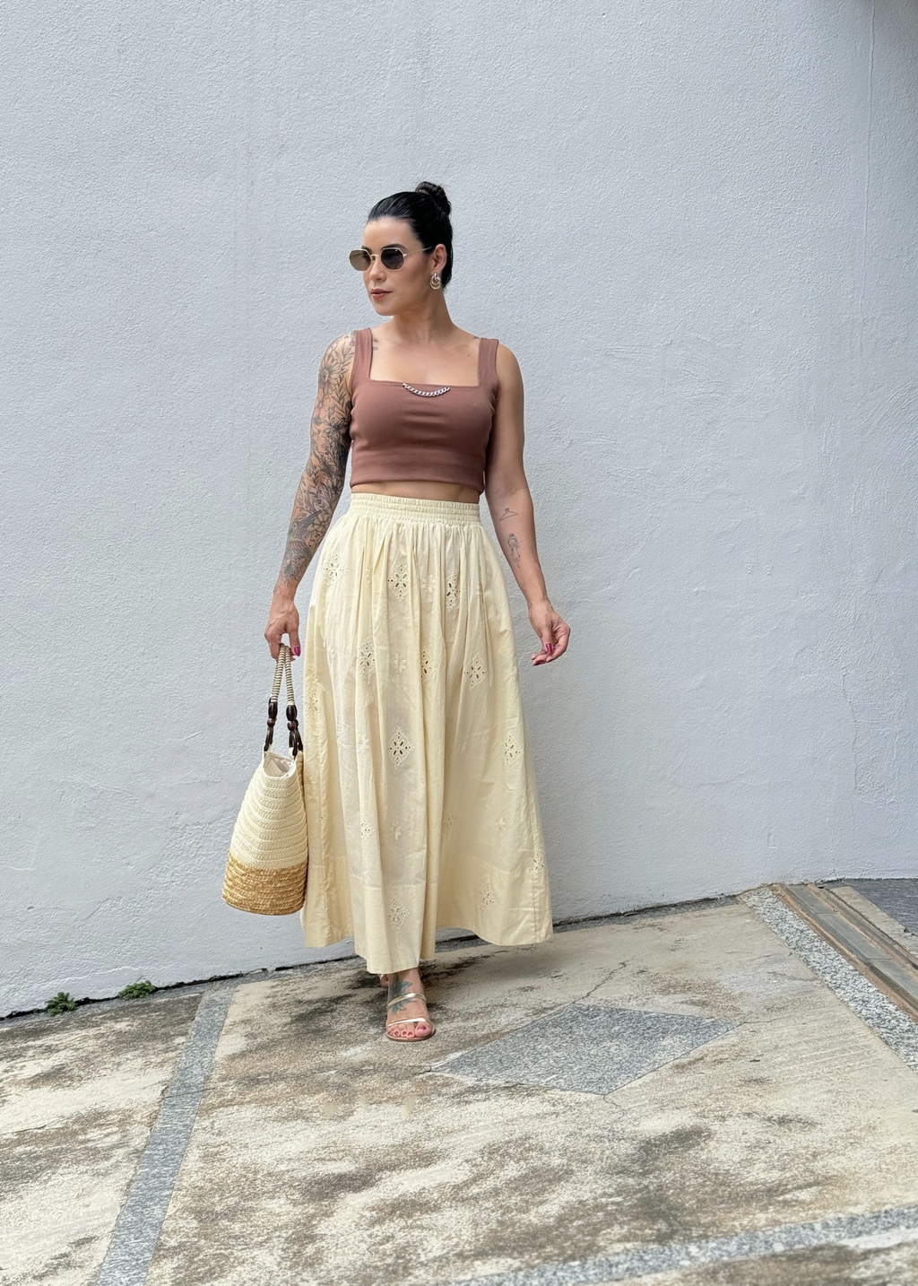 Confeccionada em tecido Laise, ela vem com um delicado forro, garantindo que você se sinta à vontade e confiante. Modelagem solta e comprimento midi, o tom bege neutro permite uma fácil combinação com diferentes blusas e acessórios, tornando-a um item versátil no seu guarda-roupa.