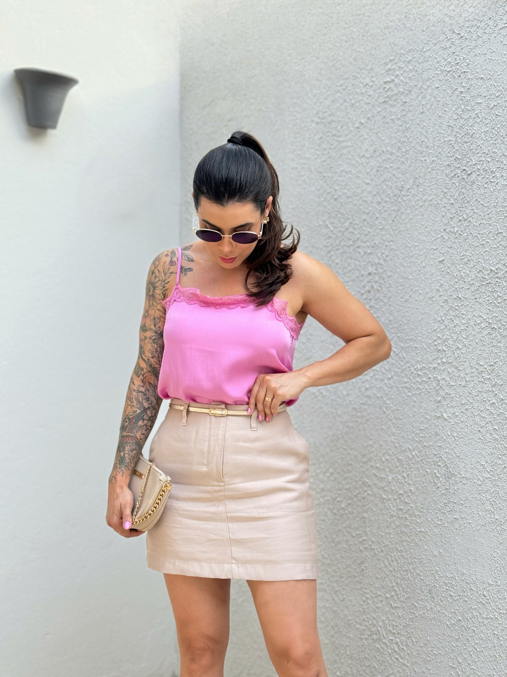 Short saia com cintura alta, cós com passantes permite que você use um cinto, se desejar. O fechamento por zíper frontal garante praticidade e um ajuste perfeito. A modelagem da saia na parte da frente e de trás com shortinho por baixo proporciona segurança e liberdade de movimentos, ideal para curtir o dia inteiro.