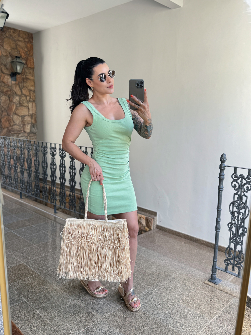 Confeccionado em tecido canelado e modelagem justa, esse vestido curto apresenta um decote redondo no busto e nas costas que valoriza a silhueta. O drapeado nas laterais adiciona um toque de sofisticação, tornando-o perfeito para diversas ocasiões.