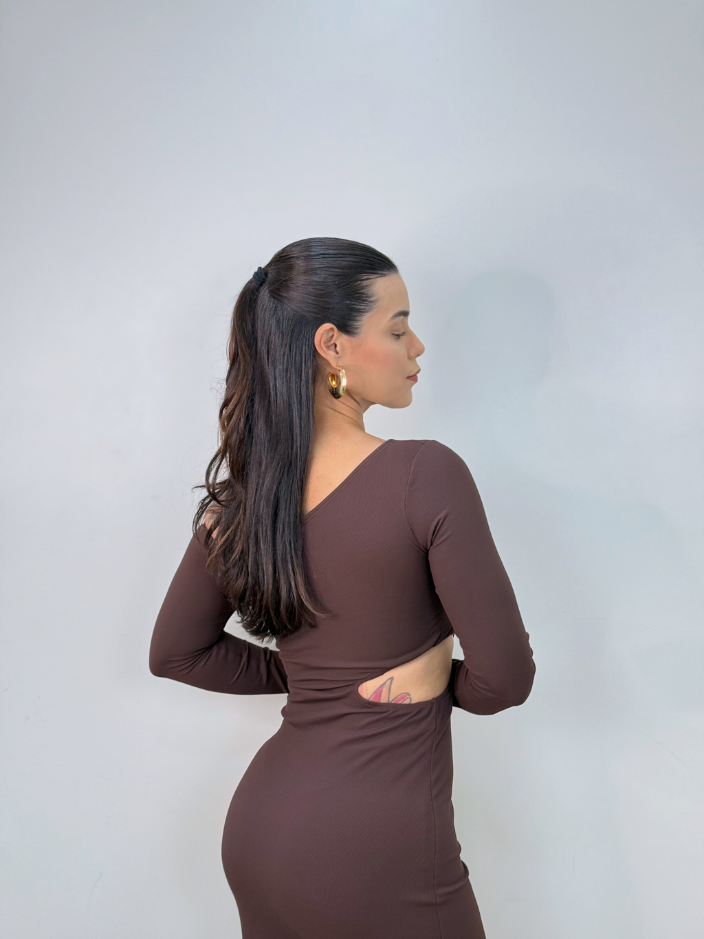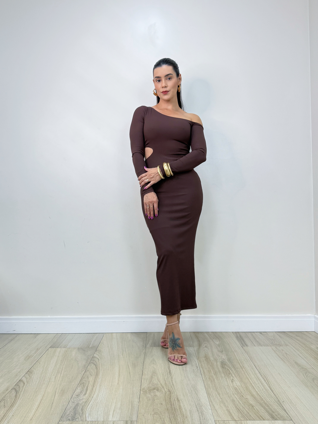 Este vestido encantador possui decote assimétrico e mangas longas, garantindo uma modelagem justa que valoriza o corpo. Seu comprimento midi é perfeito para diversas ocasiões. Confeccionado em tecido canelado, o modelo conta com forro e um recorte estratégico na lateral da cintura.