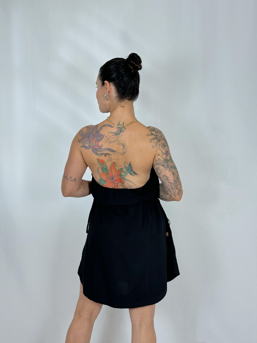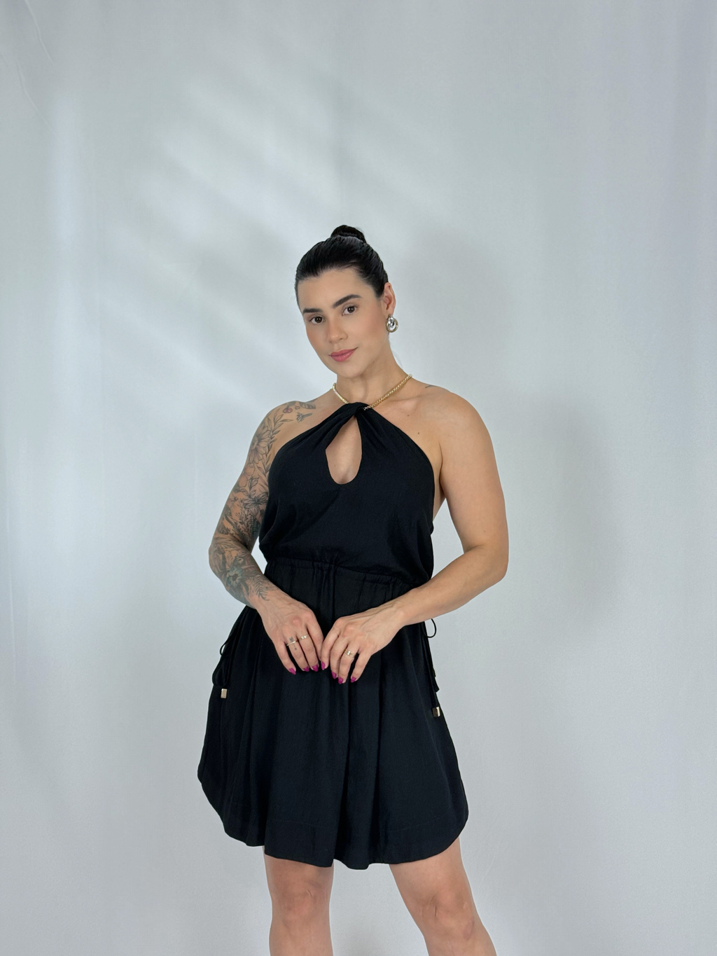 Com frente única e um sofisticado detalhe de corrente no pescoço, este vestido proporciona um toque de glamour ao seu look. A cintura com ajustes nas laterais garante um caimento perfeito, enquanto o comprimento curto adiciona um ar moderno e ousado. Confeccionado em tecido de alta qualidade.