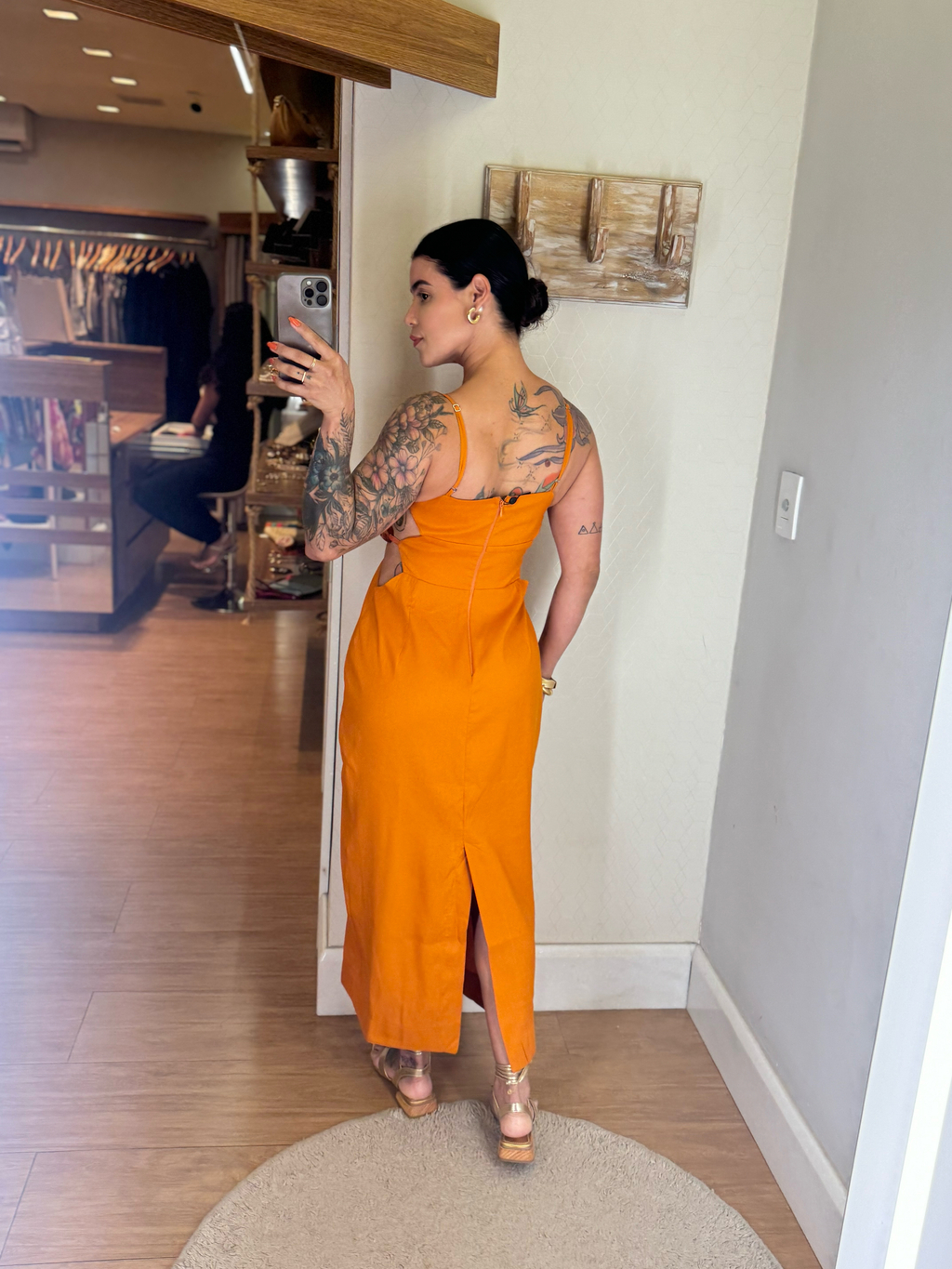 Os detalhes laterais na cintura, com abertura e aplicação de resina, adicionam um toque especial à peça. Além disso, a fenda na barra traseira confere um charme extra ao look.